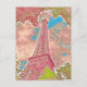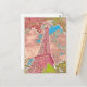 La Torre Eiffel de París en tonos rosas, rosas y corales contra un cielo azul y ramas con hojas, hace una postal impresionista de temática bonito.