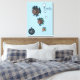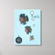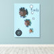 Familia de peces azules. Tres peces cerámicos, cada uno con flores diferentes en el cuerpo y aletas azules y verdes de hilados. Grande (papá) lleva a mamá y a los peces bebés hacia adelante. El texto que dice "Familia" se sitúa en la parte superior derecha entre las burbujas. La esquina inferior izquierda muestra un rosa de brújula para dar dirección. Fondo azul pálido. Obra original de Nora Chen.
