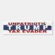 Pegatina antiparachoques de Trump. Trump es antipatriótico. Él evita los impuestos cuando el resto de nosotros tenemos que pagar. Dice que no paga impuestos porque es inteligente. Así que debe pensar que el resto de nosotros somos estúpidos. Cuando Donald Trump no paga impuestos, guarda dinero de los veteranos, las escuelas y más. Si Trump no paga impuestos como el resto de nosotros, entonces no debería ser nuestro presidente. Trump debería pagar impuestos como el resto de nosotros. Si el pueblo norteamericano está pagando impuestos, entonces también debería hacerlo el presidente norteamericano. ¡Paga tu parte justa, Trump! Anti-Trump. Pro Hillary. Dump a Trump. Evasión de impuestos a Trump. Tributos a Trump. Trump tiene sus productos de ropa hechos en el extranjero. ¿Por qué no contratará estadounidenses para hacer sus cosas? La codicia. Si quiere crear empleos, debería tener sus productos hechos en Estados Unidos. Trump no es un patriota.