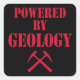 Powered By Geology - pegatina negro con letras de esténcil rojo y cruzado gráfico de martillos de roca.