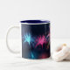 Cinco rociadas de fuegos artificiales reflejadas en el agua oscura bajo - una ráfaga de azul pálido, rosa rosa, oro brillante y verde menta, y en el centro destellan todos los colores del arco iris.
