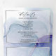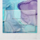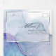 Salpicadura etérea de manchas de tinta de alcohol en tonos de aqua llamativo, violeta púrpura y lila pálido, cada sección resaltada con una superposición blanca transparente enmarcada en plata platino, en el centro delantero está su foto acentuada con un doble marco dorado y detrás de la superposición blanca para un atractivo esotérico, un hermoso diseño abstracto moderno para una invitación de boda todo en uno, completa con una tarjeta de respuesta de elección de comida pre-direccionada y desmontable para que sus invitados puedan enviarla fácilmente por correo: una impresionante invitación de boda todo en uno.