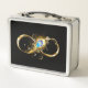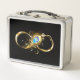 Oro, símbolo brillante de infinito, decorado con una pluma de pavo real de joyas con un fondo turquesa en negro.