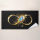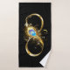Oro, símbolo brillante de infinito, decorado con una pluma de pavo real de joyas con un fondo turquesa en negro.