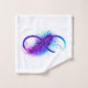 Símbolo de infinito con una hermosa pluma pintada en colores brillantes púrpura y azul sobre fondo blanco.