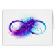 Símbolo infinito con una hermosa pluma pintada de color violeta y azul brillante sobre fondo blanco.