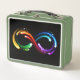 Symbol of infinity is artistically painted with fast moving, bright, luminous, rainbow colored comets with long flexible tails on black background. Rainbow infinity.