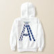 Letra inicial A hecha con imágenes de guijarros de zafiros en corte rectangular, corte de peras y corte marquesa, dentro del corte trapezoide central y adornos cortados de fantasía en el gran zafiro marquesa, acentuado con una flor blanca en la parte superior de la letra A. Sapphire es la piedra de nacimiento de septiembre. El azul es el color del Throat Chakra.