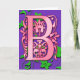 La letra B en una tarjeta elegante ornamental. Inicial del rosa en un fondo violeta, con el detalle verde del follaje. Disponible en tarjetas de felicitación, notecards o postales. Sobres incluidos con el saludo o los notecards (ningunos sobres con las postales), interior en blanco.  Compra en bulto y reserva.