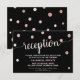Esta tarjeta de inserción de recepción de boda con glam en oro rosa y negro es perfecta para una boda sofisticada o nocturna. El diseño presenta hermosa caligrafía moderna con lámina de oro rosa falsa y confeti sobre un fondo negro para un look audaz y glamoroso. Personalice esta tarjeta de detalle con la información de su recepción e incluya también la dirección de su sitio web de boda.