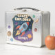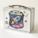Esta divertida caja de almuerzo de metal personalizada cuenta con una audaz y vibrante insignia de explorador espacial. En el centro de la insignia hay un divertido cohete de dibujos animados que vuela a través del espacio con planetas orbitando alrededor.