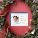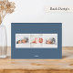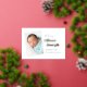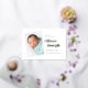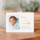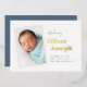 Las tarjetas de presentación de natalidad modernas y frescas incluyen una foto vertical con un borde de instantánea blanca, colocada diagonalmente con el nombre de su bebé en Relieve metalizado dorado al lado. Las estadísticas de nacimiento del bebé y su firma familiar completan el diseño. Añade tres fotos más atrás.