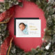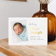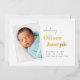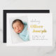 Las tarjetas de presentación de natalidad modernas y frescas incluyen una foto vertical con un borde de instantánea blanca, colocada diagonalmente con el nombre de su bebé en Relieve metalizado dorado al lado. Las estadísticas de nacimiento del bebé y su firma familiar completan el diseño. Añade tres fotos más atrás.