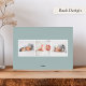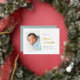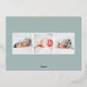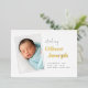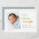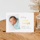 Las tarjetas de presentación de natalidad modernas y frescas incluyen una foto vertical con un borde de instantánea blanca, colocada diagonalmente con el nombre de su bebé en Relieve metalizado dorado al lado. Las estadísticas de nacimiento del bebé y su firma familiar completan el diseño. Añade tres fotos más atrás.