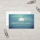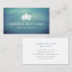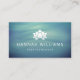 Elegantes tarjetas horizontales de negocios para los estudios de yoga, instructores de yoga, spas o profesionales del bienestar. Esta tarjeta contiene una flor de loto blanco sobre un sutil fondo azul y verde con olas tranquilizadoras.