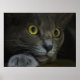 Un primer plano de la cara de un gato gris con ojos amarillos y pupilas dilatadas, apoyándose en su pata y mirando con atención algo detrás de la cámara.