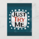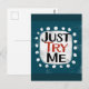 Un divertido diseño tipográfico que dice "Just Try Me" (Pruébeme). Es texto en negro y rojo sobre un rectángulo blanco con puntos blancos divertidos y juguetones rodeándolo, todo sobre un fondo verde azulado.