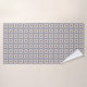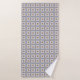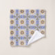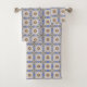 Towel and washcloth with intricate blue, yellow, and white geometric patterns. The towel hangs on a rod, while the washcloth is displayed flat, with a corner folded.