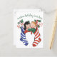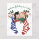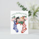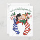 Ilustracion de época Feliz Navidad diseño con mellizos colgados en medias de Navidades decoradas con hojas y bayas huecas. El chica está en el caldo azul y blanco a rayas y el niño está en el caldo rojo y blanco a rayas. ¡Una imagen tonta, divertida y humorística, genial para toda la familia!
