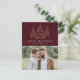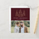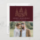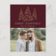 Postal vacacional moderna y elegante con una foto complementada por un nevado árbol de Relieve metalizado dorado con fondo burdeos (o color de su elección). "Feliz Navidad" se muestra en una fuente serif moderna y blanca con tu nombre o texto personalizado debajo. La tarjeta postal de festividad fotográfica se revierte para mostrar su dirección de retorno y mensaje de personalizado.