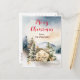Esta hermosa y festiva postal de Navidades acuáticos puede ser personalizada con su nombre familiar. Cuenta con una casa de campo rústica de invierno rodeada de nieve, montañas y árboles. Hay animales adorables, como un reno y un perro, además de un muñeco de nieve, setas, bellotas y follaje. El texto combina guiones manuscritos y sans serif para un estilo elegante y moderno.