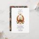 Una clásica invitación al estilo del Viejo Mundo con un medallón de regal, laurel de flores y dos anillos bodas. La parte trasera está decorada con una huella floral azul marino de estilo William Morris.