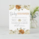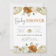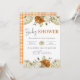 Bienvenido a un nuevo pequeño con esta encantadora invitación para baby shower inspirada en el otoño. Con elegantes calabazas blancas, flores de color óxido y delicado follaje dispuestos alrededor de un borde a cuadros naranja acogedor, este diseño captura perfectamente el calor de una celebración con tema otoñal.
