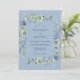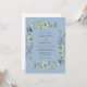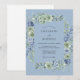 Este diseño presenta una paleta de colores tranquila de azul de aciano suave y verde salvia, creando una atmósfera romántica y aireada. Delicadas rosas de acuarela y hortensias exuberantes están dispuestas artísticamente en toda la composición, complementadas con hojas y ramitas delicadas. Las texturas pictóricas y los tonos suaves evocan un sentido de elegancia atemporal para un evento botánico.