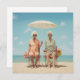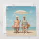 Dos señoras elegantes sentadas bajo un paraguas son el sol en la playa española de Marbella