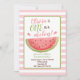 ¡Uno en una invitación de cumpleaños de melón para una fiesta de primer cumpleaños de la sandía! Incluye un ilustracion de sandía rosa y verde dulce. © 2021 Tea Olive Co.