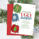 Este diseño presenta una invitación a la fiesta de los Navidades, con un suéter divertido y feo, un diseño de acuarela adorable, un estilo festivo único con un verde rojo, y una tipografía moderna azul, azul, fiesta de vacaciones, fiestas clásicos, caprichosos, muy buenos para los fiestas de negocios o corporativos también,