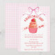 At the center of this baby shower invitation sits an adorable cupcake crowned with a sweet strawberry. A soft watercolor gingham backdrop and a delicately tied bow complete the look, creating a celebration that feels warm, whimsical, and beautifully inviting.