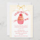At the center of this baby shower invitation sits an adorable cupcake crowned with a sweet strawberry. A soft watercolor gingham backdrop and a delicately tied bow complete the look, creating a celebration that feels warm, whimsical, and beautifully inviting.