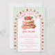 At the center of this baby shower invitation is the sweetest strawberry shortcake, framed by a scalloped border sprinkled with tiny strawberries like little kisses of summer. Set against a soft watercolor gingham backdrop, the whole design feels light, nostalgic, and delightfully fresh.