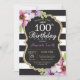 100.ª invitación a las mujeres por el cumpleaños. Invitación a la fiesta de cumpleaños de oro y negro. Brillantina dorada. Flor Floral color morado. Rayas blancas y negras. Pizarra. Digital Imprimible. Para una mayor personalización, haga clic en el botón "Personalizar" y utilice nuestra herramienta de diseño para modificar esta plantilla.