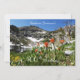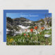 El frente de esta invitación personalizada y de moda es nuestra fotografía original de hermosas montañas, un lago helado y flores silvestres coloridas; el texto es blanco. Revertir es azul, con texto de invitación blanco. Una bella invitación a una fiesta de cumpleaños número 100. Foto original de Alan Socolik. Todos los derechos reservados © 2015 Alan & Marcia Socolik.
