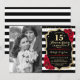 Invitación de 15º Aniversario de Boda con Foto. Diseño elegante en rojo y negro con falso oro brillante. Cuenta con rayas blancas y negras, fuente script, rosas rojas y confeti. ¡Se puede personalizar para cualquier año! Envíame un mensaje si necesitas una personalización adicional.