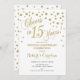 Diseño elegante con falso brillo dorado y blanco. ¡Salud por 15 años!