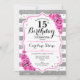 Invitación a los 15 Años Elegante diseño rosa blanco plateado con falso purpurina. Rayas blancas y plateadas con rosas rosadas. Perfecto para una elegante fiesta de 15 años.