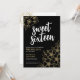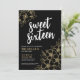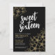 16.º Dulce Floral de Oro Negro Dieciséis Invitaciones de Cumpleaños. Una divertida pero elegante invitación a la fiesta de cumpleaños número 16 con elegantes contornos de flores doradas y blancas. Atención: el "oro" es sólo un color, no hay Relieve metalizado ni brillo. Un patrón de flores juguetón enmarca una tipografía de escritura "dulce dieciséis" mezclada con un tipo de letra serif más clásico. Celebre 16 años de vida con este elegante y bonito diseño botánico. La parte divertida es que puedes cambiar TODOS los colores. No sólo se pueden cambiar los colores de fondo y el tipo de letra, sino que también se pueden cambiar las líneas de las flores. Disponible en forma de invitación impresa, o como una invitación digital descargable que puede enviar por correo electrónico o que ha impreso localmente.