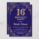 Invitación de cumpleaños 16 a Purpurina azul y oro de la marina de cumpleaños. Para una mayor personalización, haga clic en el botón "Personalizar" y utilice nuestra herramienta de diseño para modificar esta plantilla.