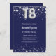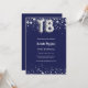 Una invitación moderna, elegante y glamurosa para una fiesta de 18 años. Un fondo azul marino, decorado con estrellas de imitación plateadas. Personalice y agregue su nombre y detalles del fiesta. El número 18 se escribe con un tipo de letra de estilo globo.
