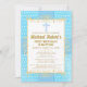 Invite a su familia y amigos al primer cumpleaños y bautismo de su bebé. El azul y el dorado están decorados con elementos dorados y los puntos de polka blancos sobre un fondo de color azul. Todo el texto se puede personalizar, incluyendo el servicio de la iglesia y los detalles del fiesta.