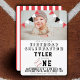 Invitación a la foto de los niños de las bolas de béisbol Cute de cumpleaños. La tarjeta tiene un tema de béisbol - béisbol y banderas de racimo rojas, negras y blancas. El dorso de la tarjeta es rojo con un patrón de franja blanca. Personalice la tarjeta con la foto del niño y personalizar el texto.