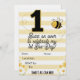 Buzz on over for the cutest celebration! This cheerful bee-themed invitation is perfect for your little one’s first birthday bash. Featuring a bold number “1,” a smiling cartoon bee with a dotted flight trail, and sunny yellow-and-white stripes, this design sets the tone for a joyful Bee-Day party. Delicate daisies and floral accents add a fresh springtime touch, while the whimsical typography invites guests to join the buzz.