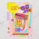 Happy Purim Festival Modern Invitation card for Family or Kids Party. Translation from Hebrew: Happy Purim! Purim Jewish Holiday poster with stars of David, traditional Hamantaschen cookies, gragger toy noisemaker, balloons, musicians, masks, Purim basket, festive confetti, fireworks on colorful abstract festive background.