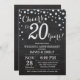 20° Aniversario del Boda Invitación a la plata y a los negros. 20º Aniversario del Boda. Fondo del diamante del Purpurina negro y plateado. Confetti plateado. Cumpleaños de adultos. Fiesta de cumpleaños de hombre o mujer. Para una mayor personalización, haga clic en el botón "Personalizar" y utilice nuestra herramienta de diseño para modificar esta plantilla.