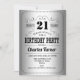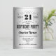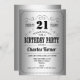 Invitación a la fiesta de cumpleaños número 21. Elegante diseño retro en plata y negro. Presenta una tipografía elegante y un Relieve metalizado falso plateado. ¡Salud a 21 años! Se puede personalizar a cualquier edad. Perfecto para una elegante celebración de cumpleaños.