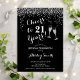 Invitación al cumpleaños 21. ¡Saludos A 21 Años! Diseño elegante en blanco, negro y plata. Incluye gafas de champán, letra de guión y confeti de plata purpurina. Perfecto para una elegante fiesta de cumpleaños. Personaliza con tus propios detalles. Se puede personalizar para mostrar cualquier edad.