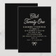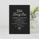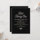 Elegant black and white invitation features white pearl script and a tiny pearl bow on a black background. Club Twenty-One gives it a hip, trendy vibe, while the bow at the bottom adds elegant femininity.